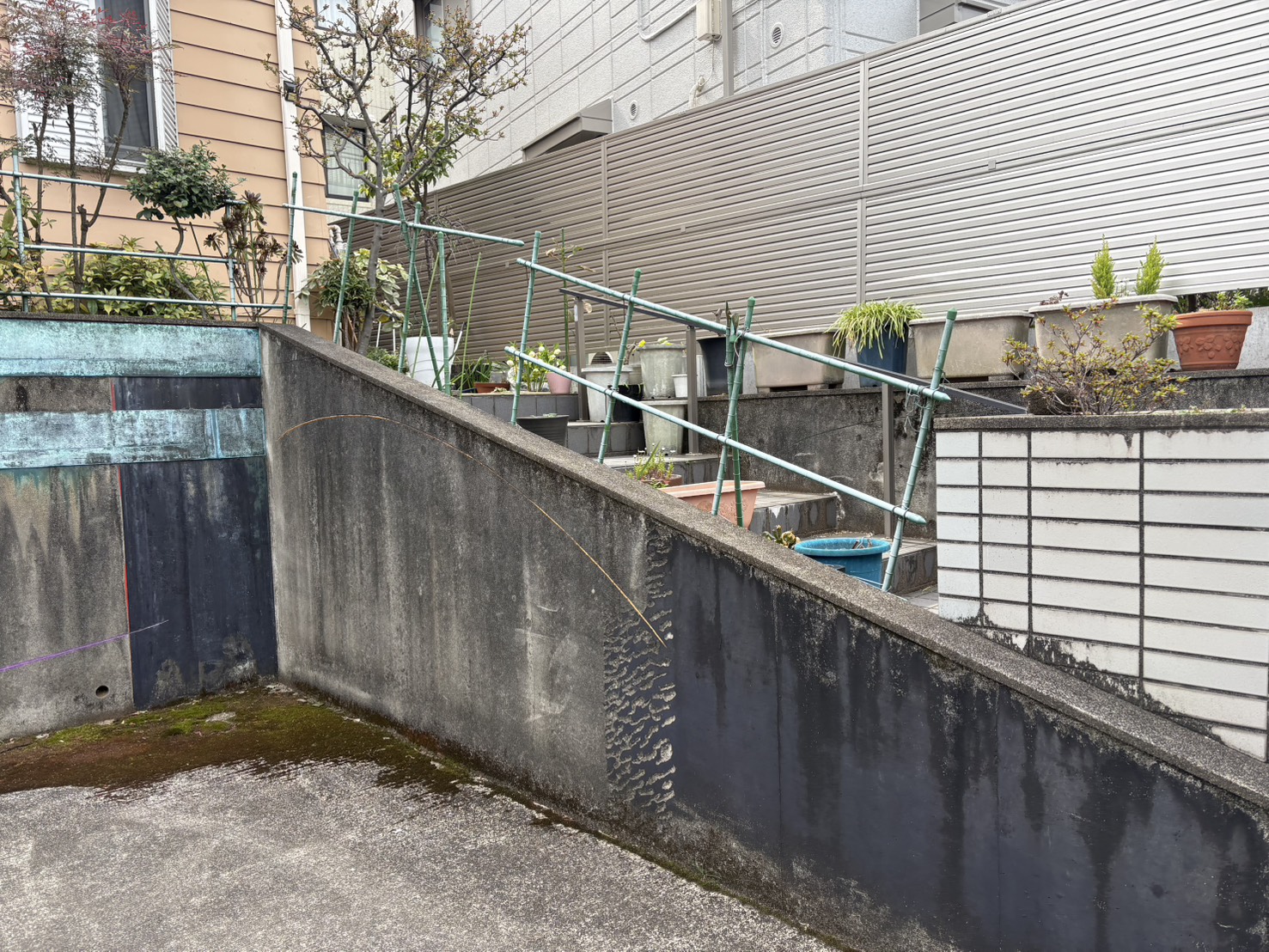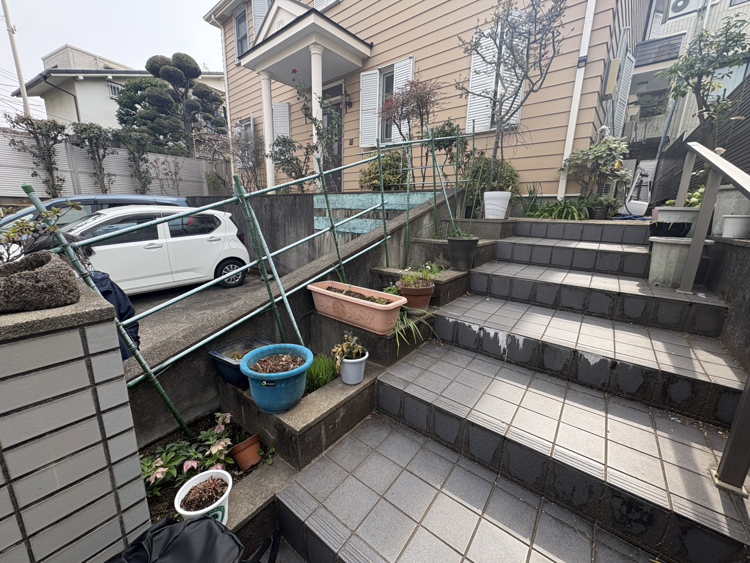 玄関前の階段に手すりやフェンスがなく、歩行者も多い道路に面しているので防犯と景観の意味合いでフェンスの設置を検討しているとのこと。以前までは樹木を植えていたが、現在は植木を減らしてしまったそうです。今後また植栽を植える可能性があるものの、現状はフェンス優先で施工してほしいとのことでした!