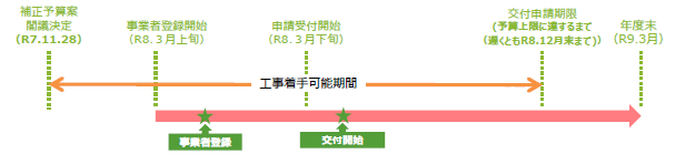環境省の資料には補正予算案の閣議決定日である令和7年11月28日以降に着工した工事は補助金の対象になると記載がありますが、補助金の申請受付開始は令和8年3月下旬を予定しています。