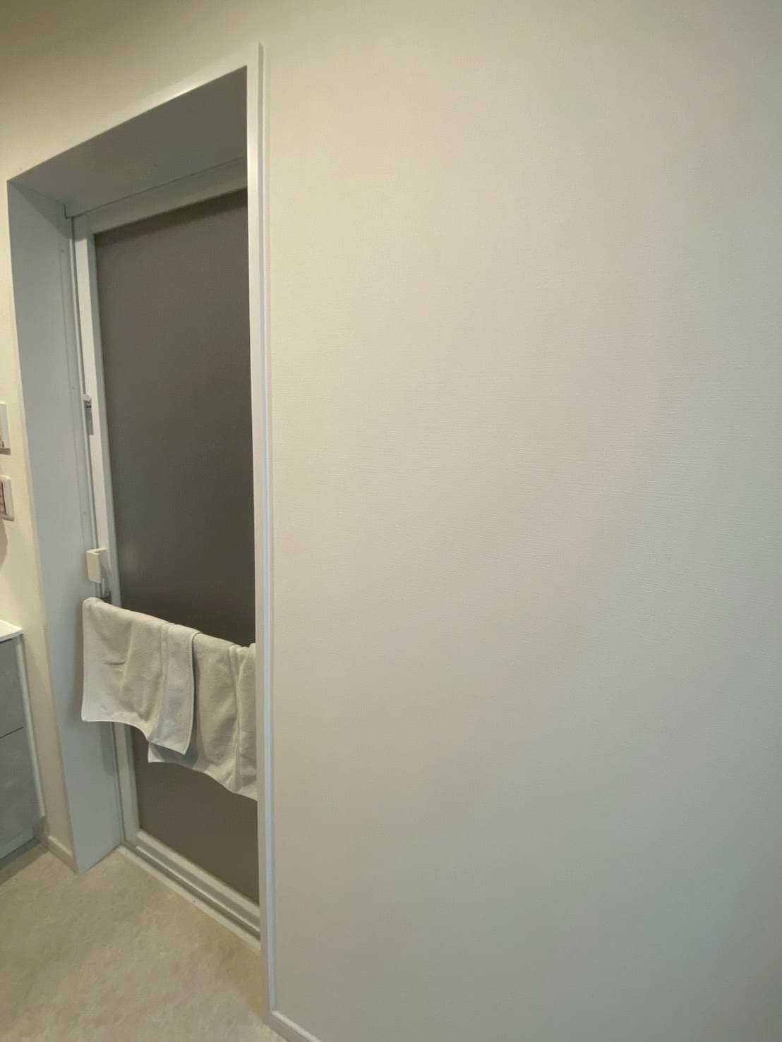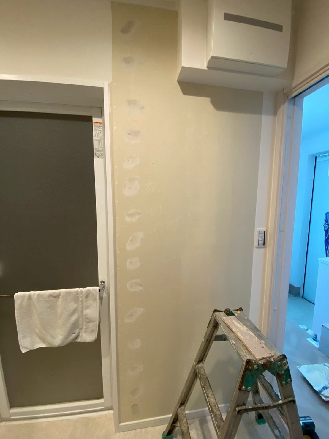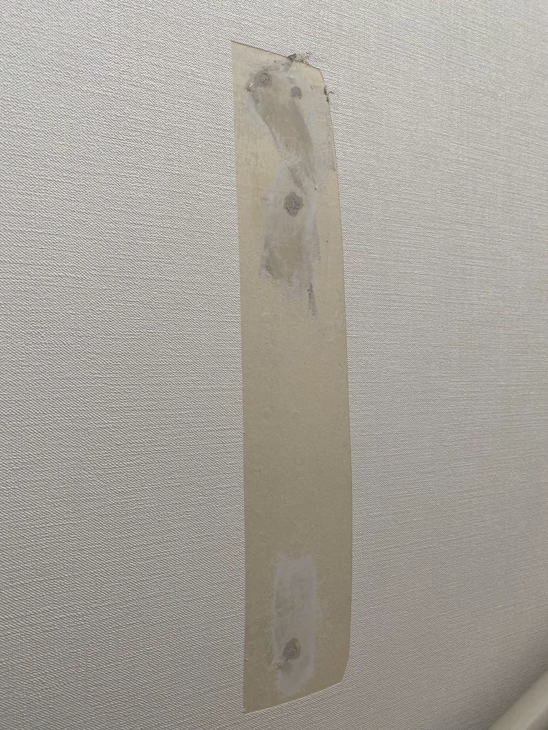 まずは該当箇所周辺の養生をさせていただき、既存のクロスを剥いで浮いてきているビスを再度ドライバーで締めてからパテ処理を行い、クロスを張り替えさせていただきました。今回は既存クロスと同じものが用意ができたので、継ぎ目が目立たないよう注意しながら作業を進めさせていただきました。お客様のご協力もあり予定通り2日間の作業で完了することができました。