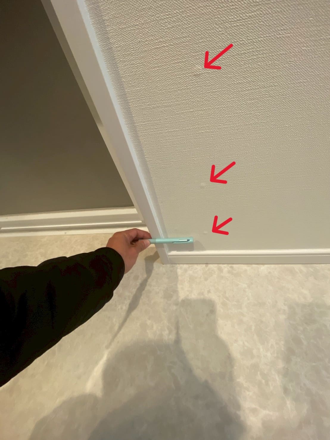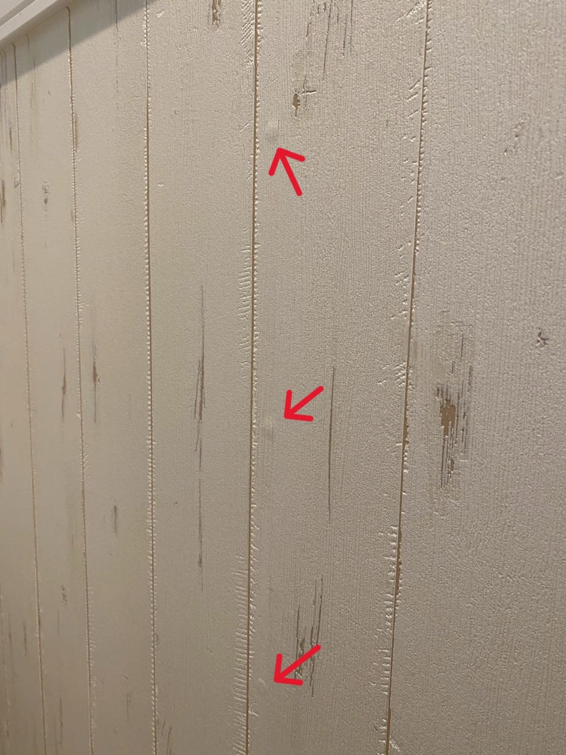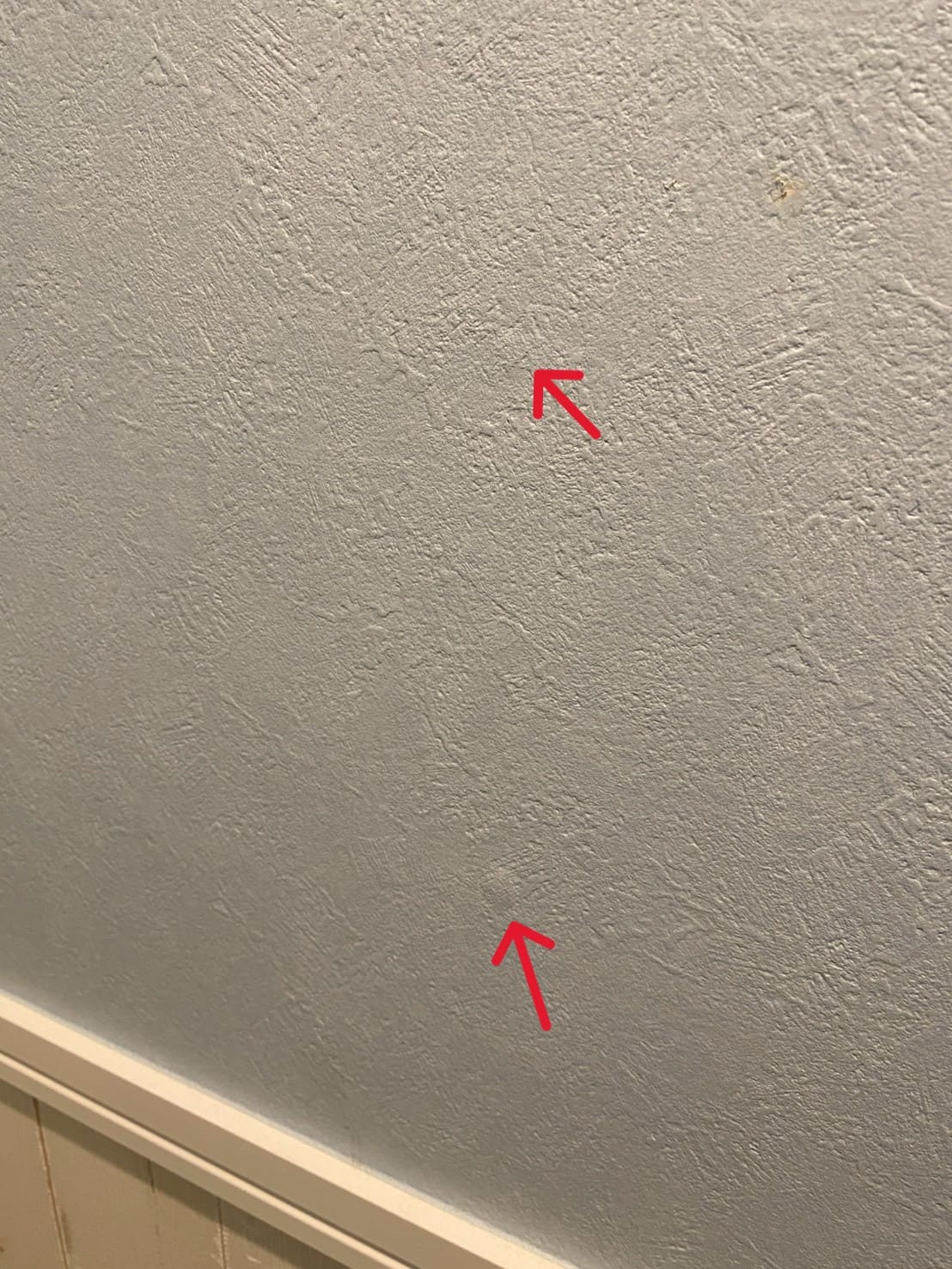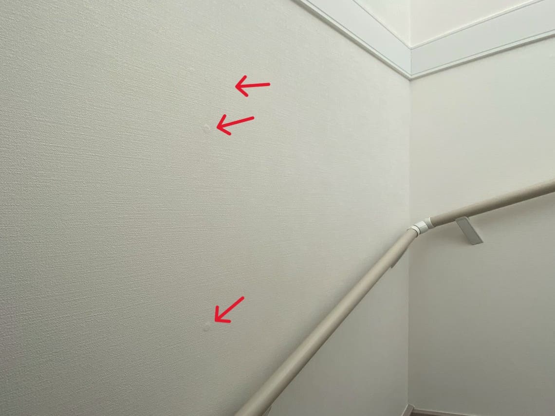 実際に現地で見させていただくとトイレや洗面所、階段やリビングの壁や天井のいたるところにビスの頭のような丸い形の浮きが確認できました。(お写真の赤い矢印の箇所です。)